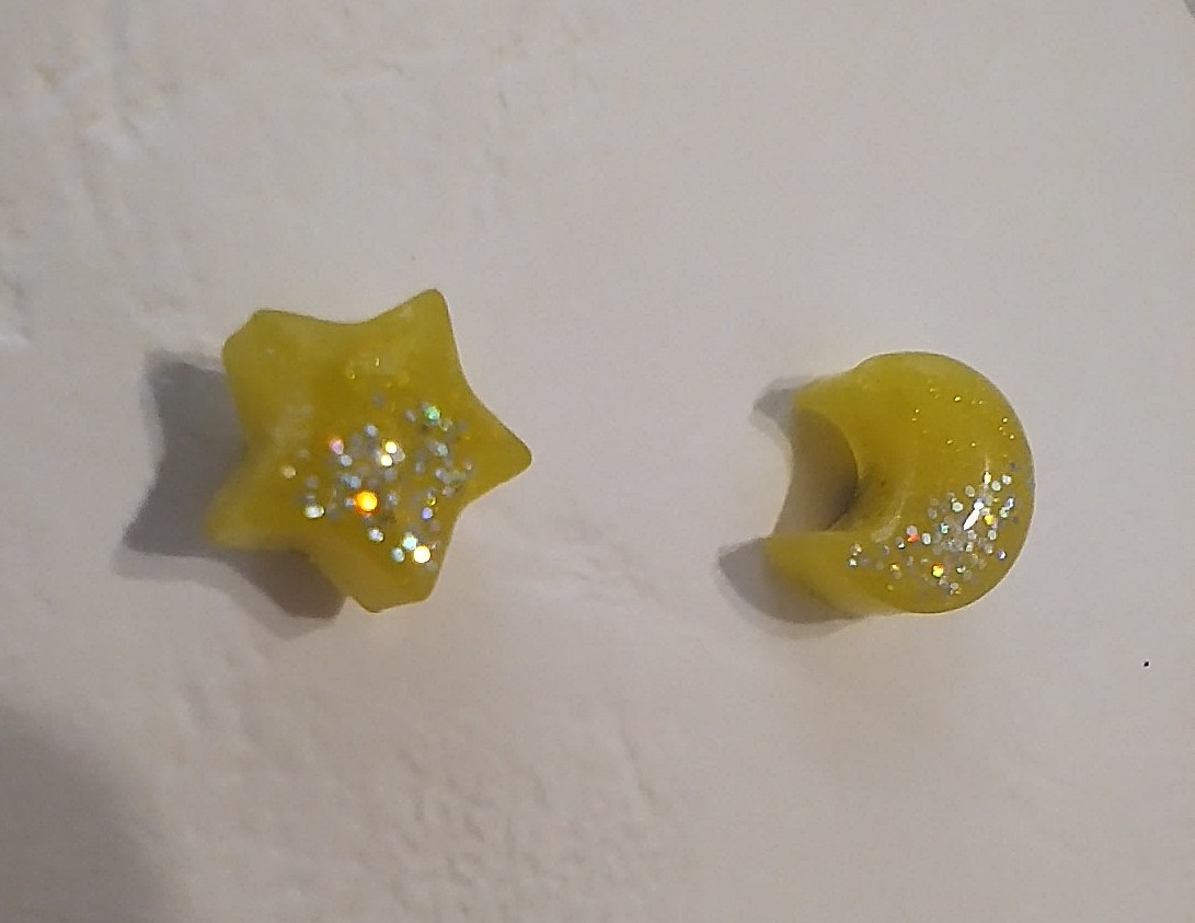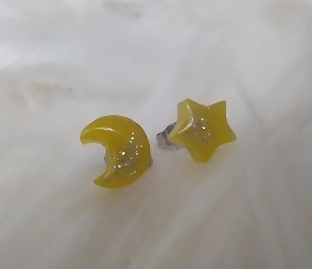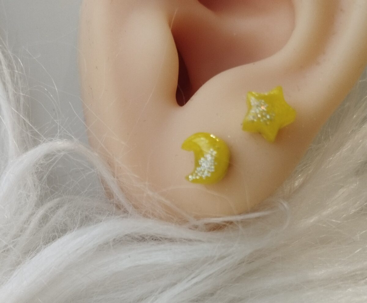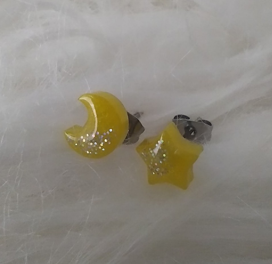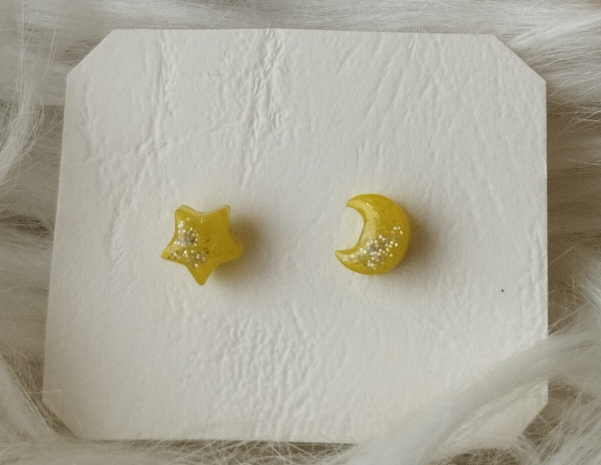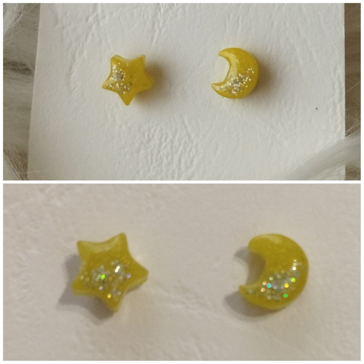 Hold és csillag formájú aranyos kis fülbevaló 🌙🌟 színes csillámmal.