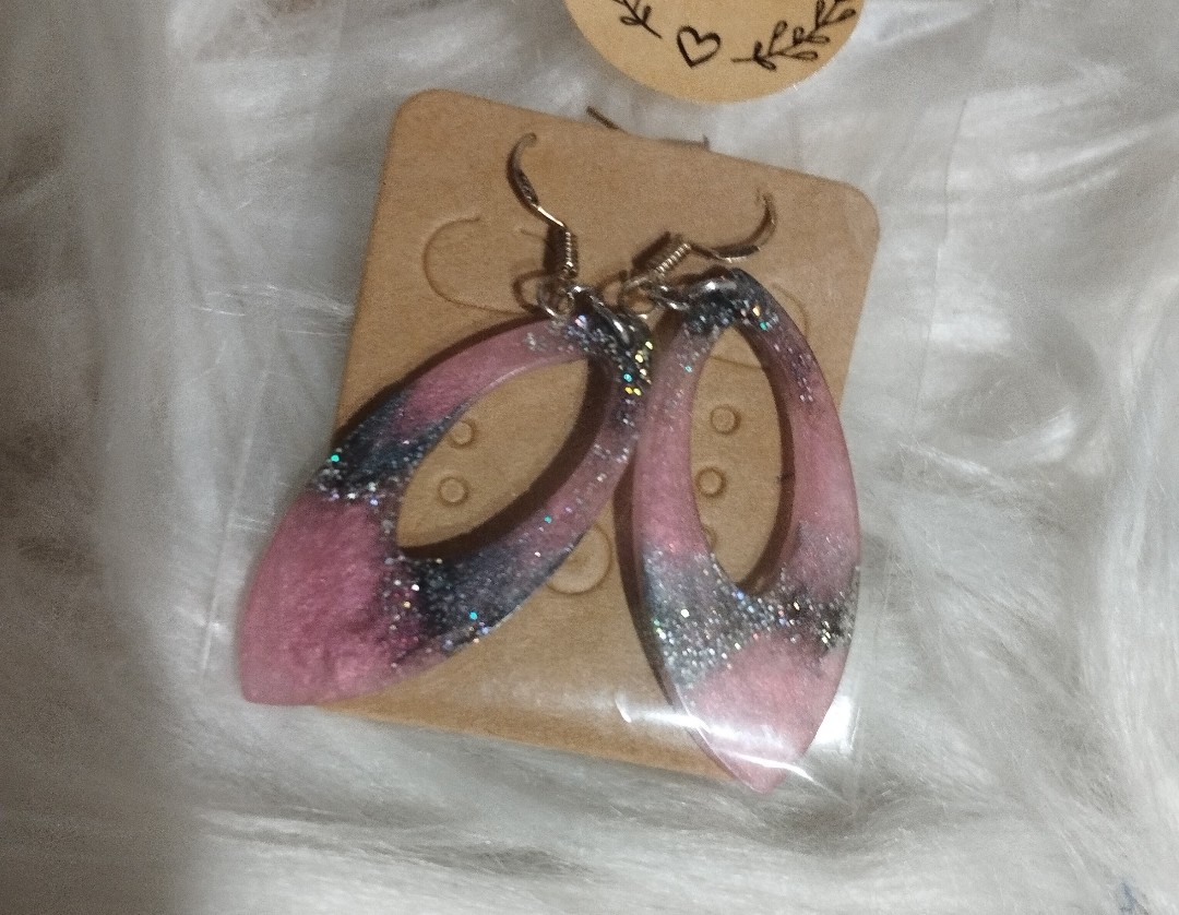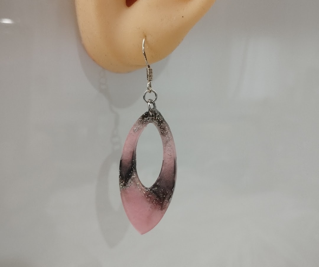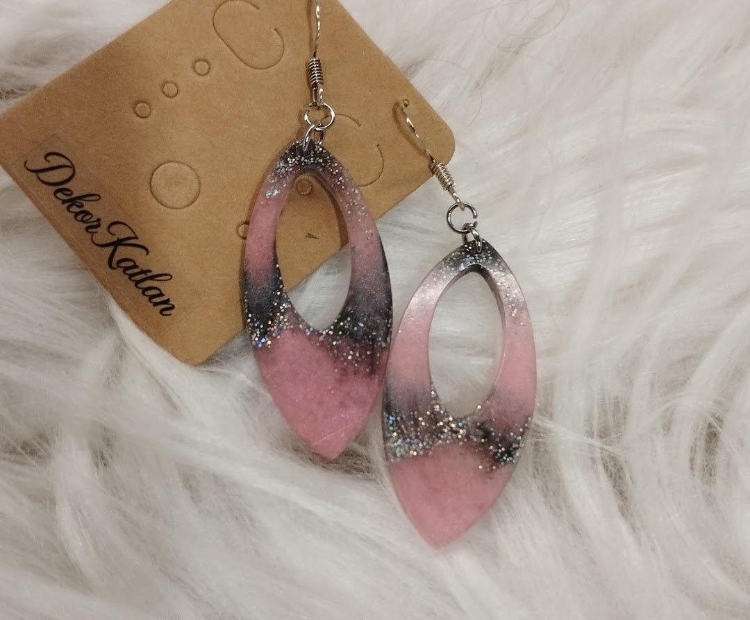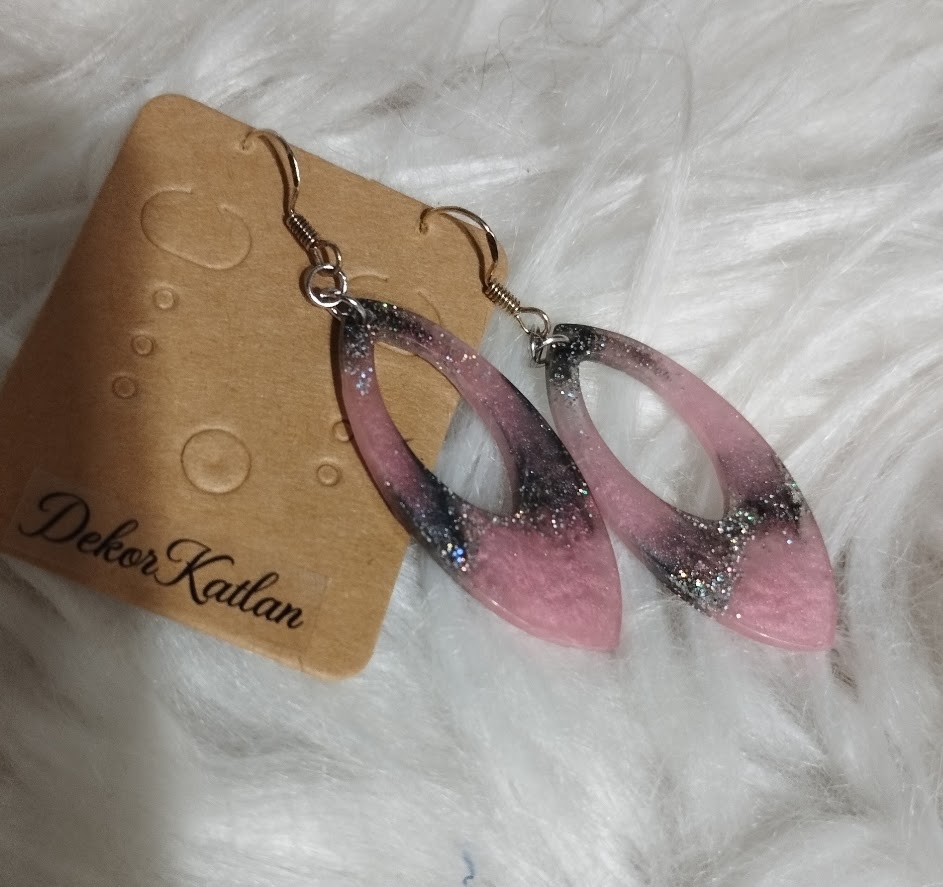 Szép rózsaszín-szürke csillámos lógós fülbevaló.