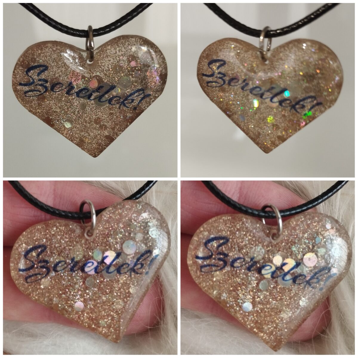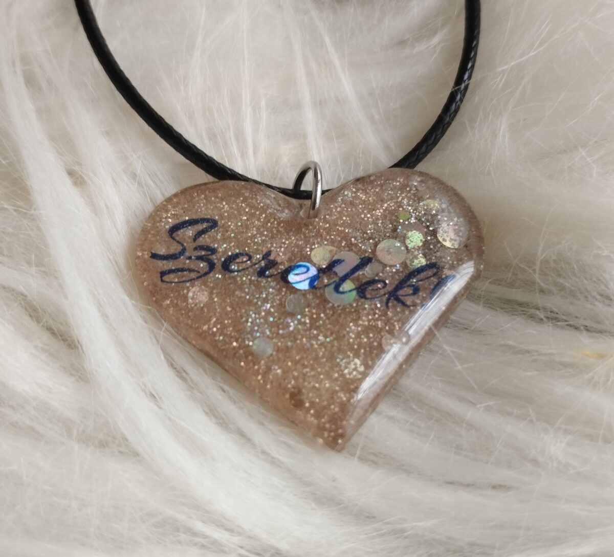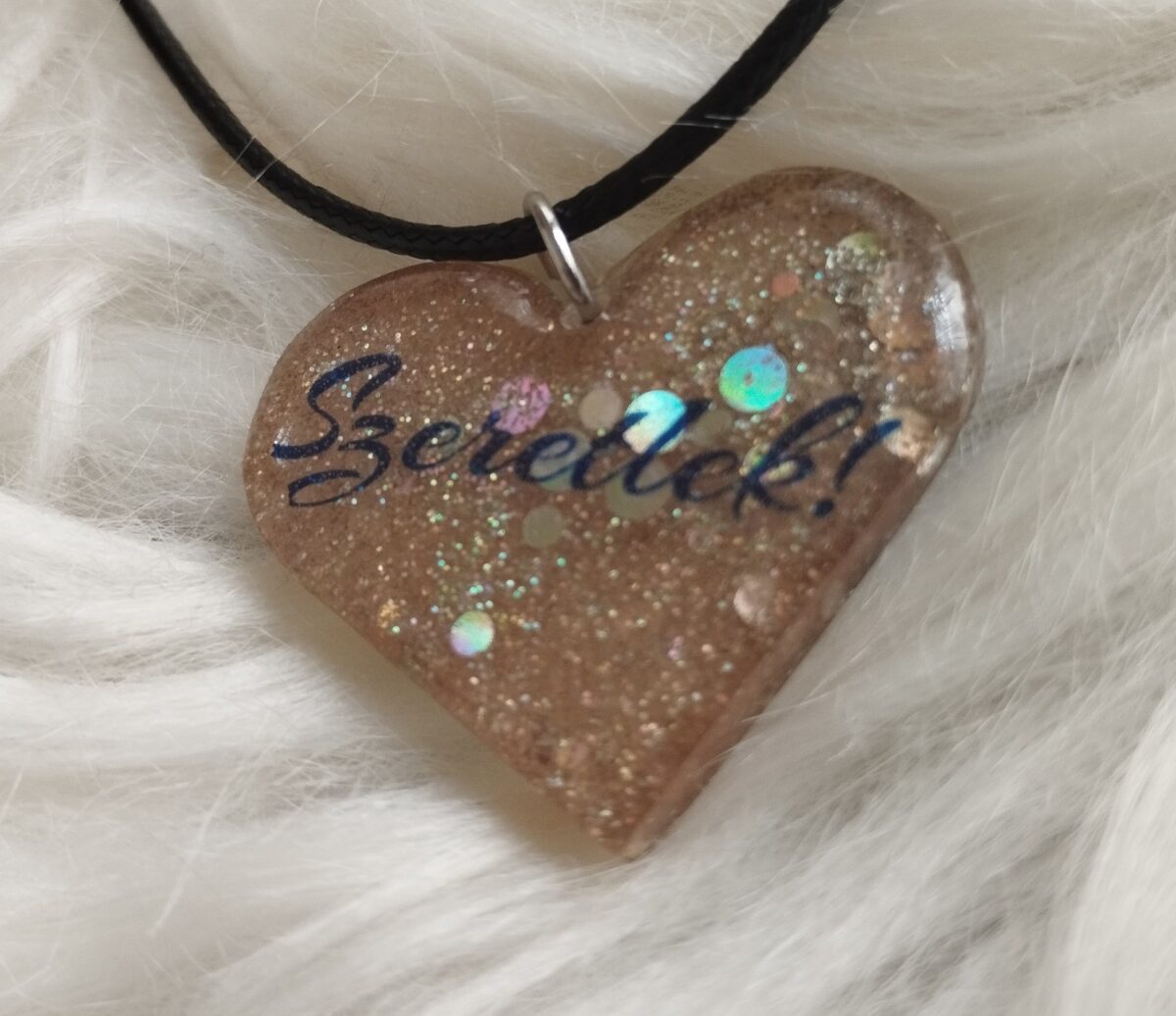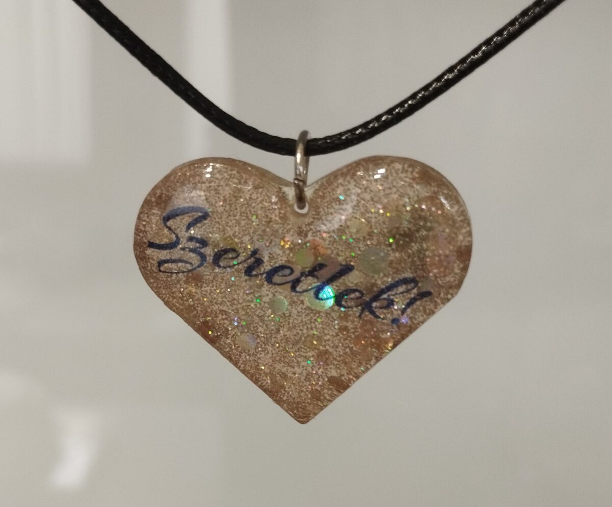 Szép kis szivecske medál viaszolt zsinegen. Műgyanta, enyhén áttetsző rózsaszínes, csillámmal, flitterrel, és „Szeretlek!” felirattal.
