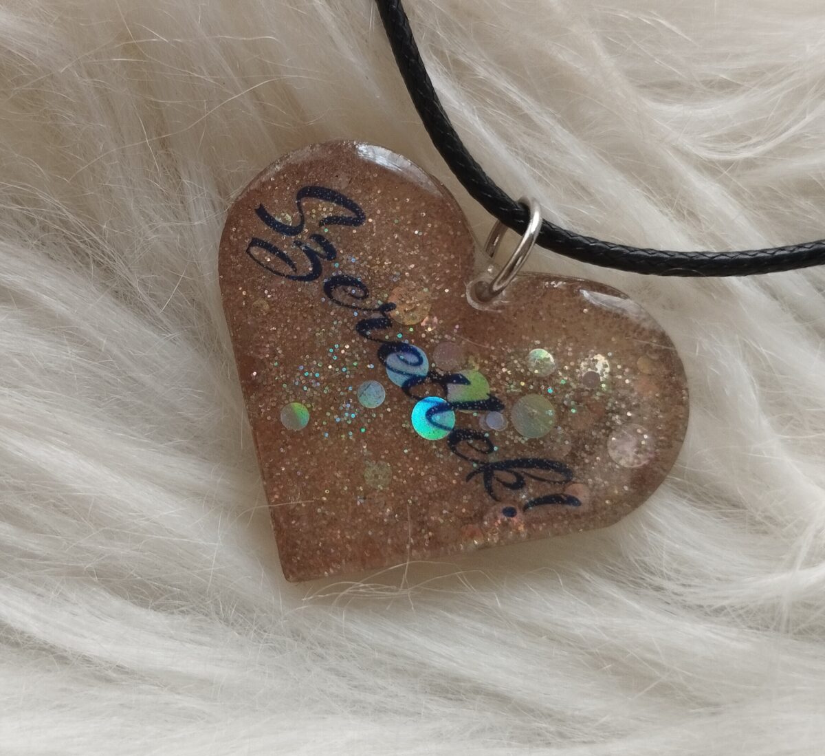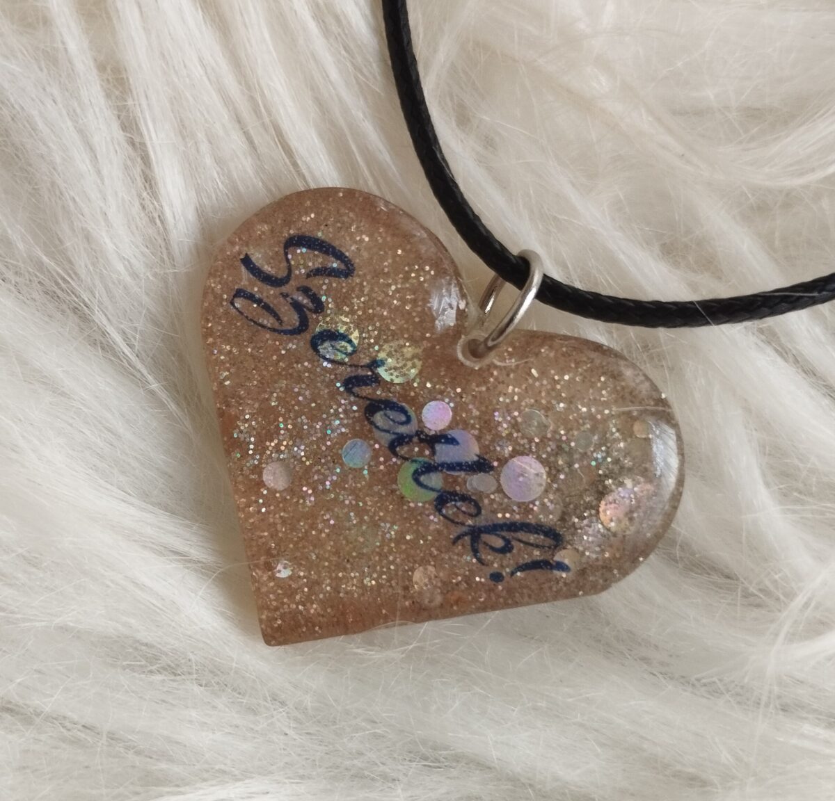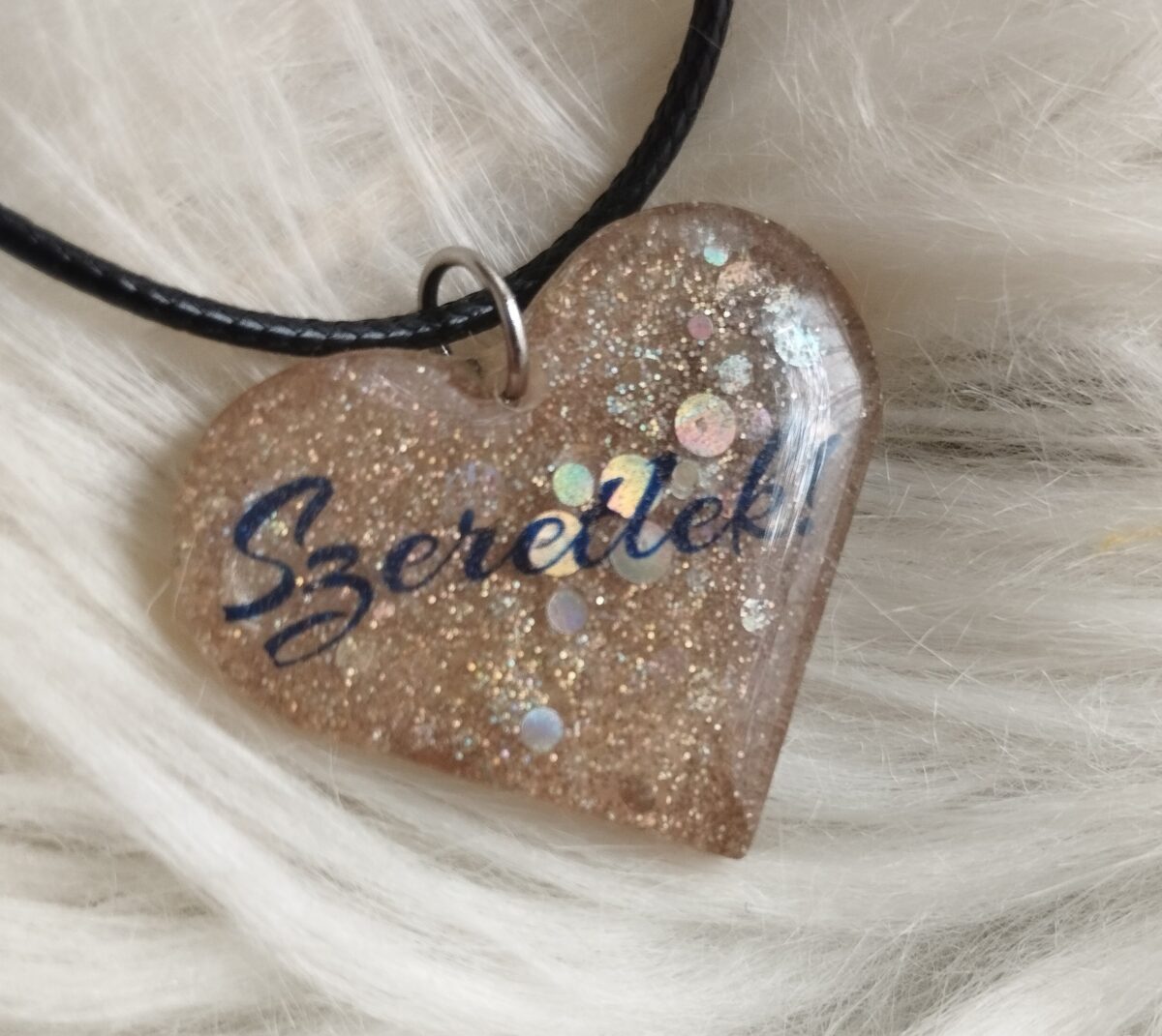 Szép kis szivecske medál viaszolt zsinegen. Műgyanta, enyhén áttetsző rózsaszínes, csillámmal, flitterrel, és „Szeretlek!” felirattal.