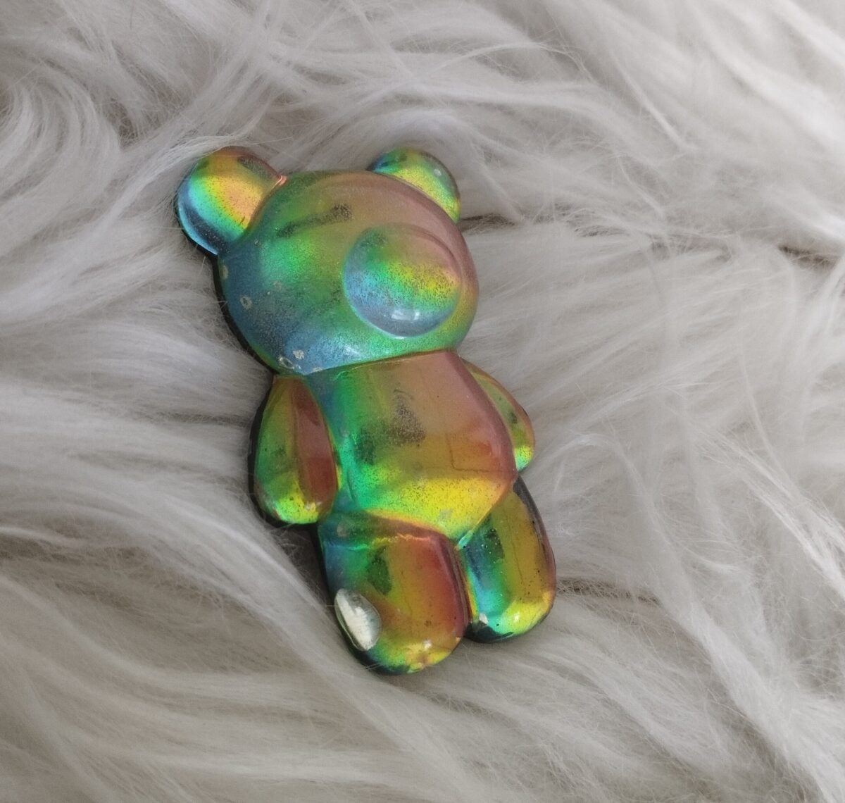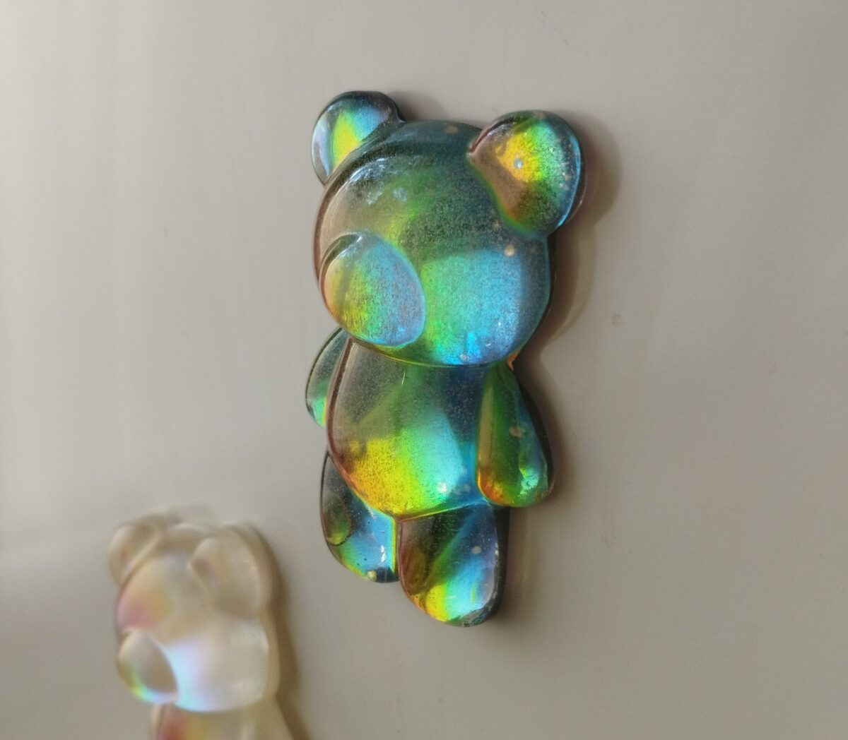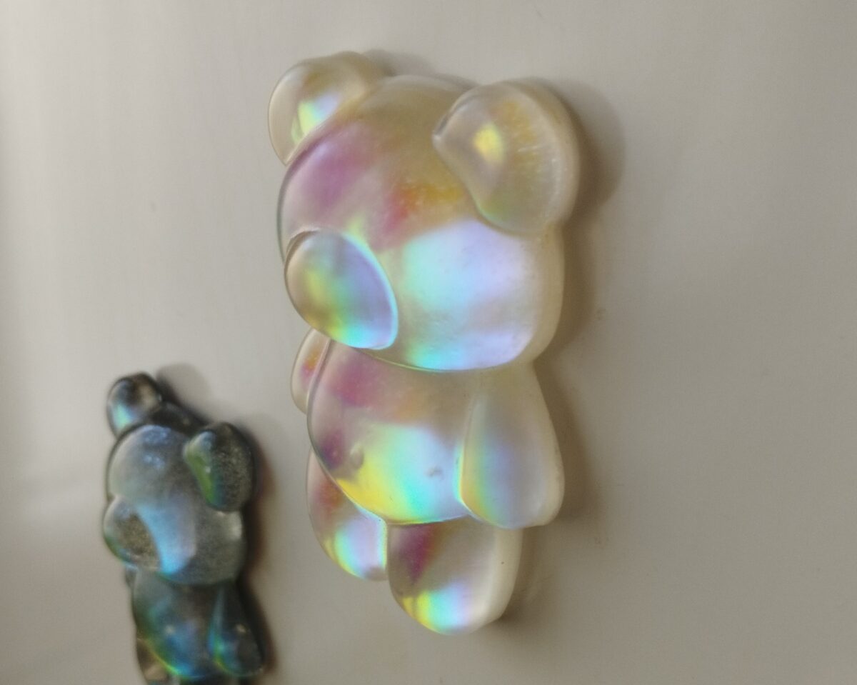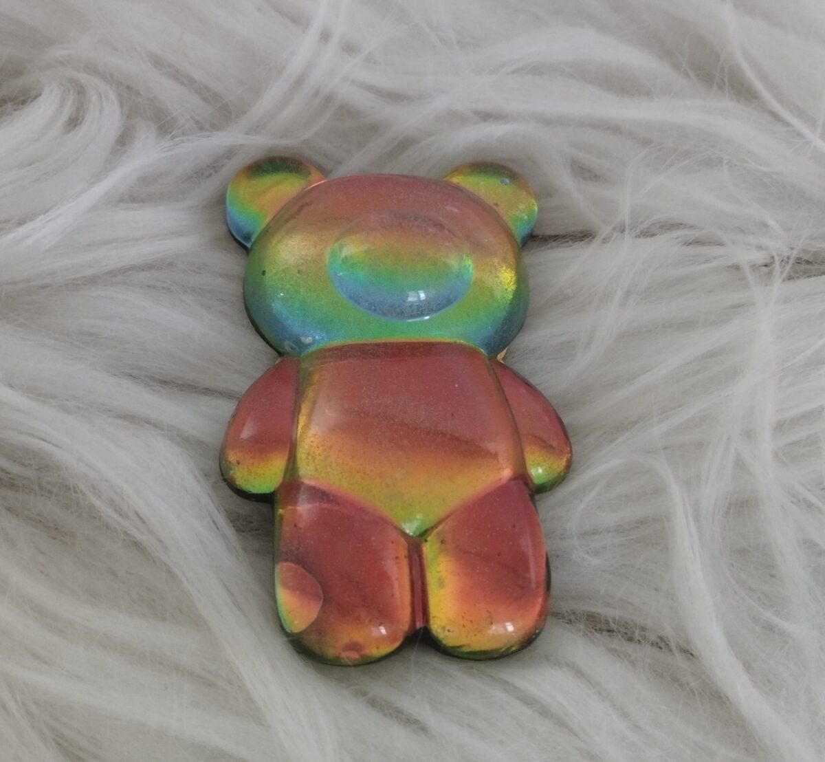 Sötét vagy világos színjátszós mackó mágnes / hűtőmágnes. Gyönyörű színekben fénylik, attól függően, hogy esik rá a fény. Hátulján mágnescsík, a maci mérete 6,6×4,1 cm.